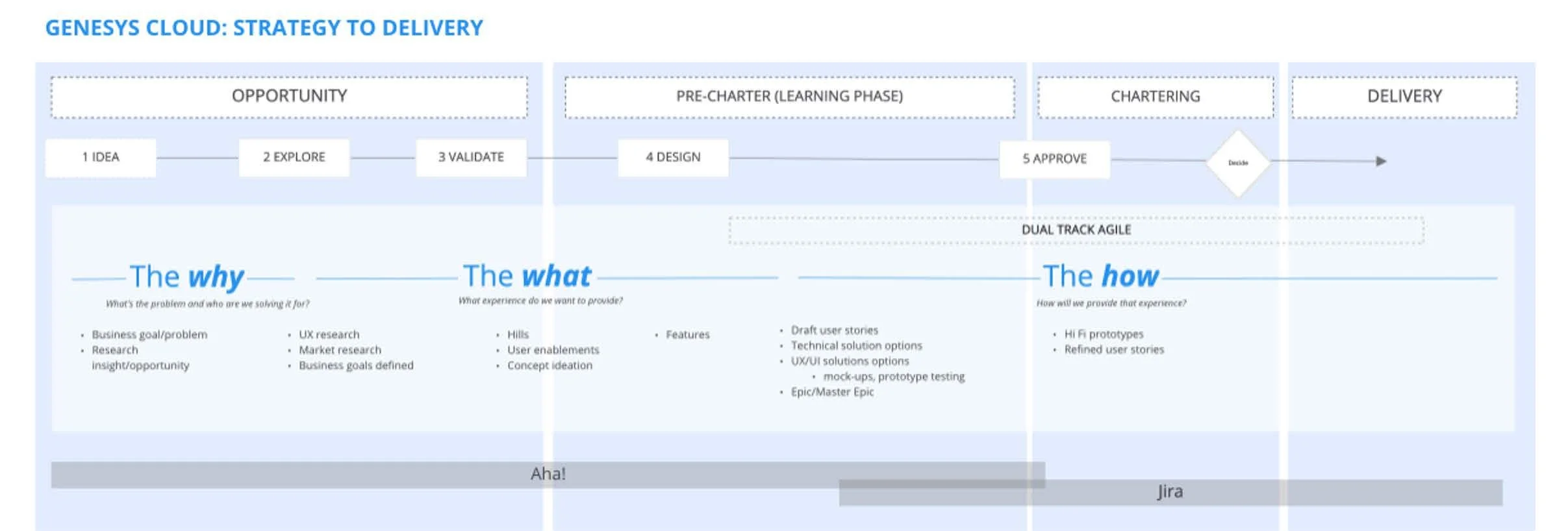 We integrated this approach into the Aha! and Jira program management processes which meant we could track from research, to concept, to delivery (including status) across products and experience. We could see how far we were at ANY time getting to our target experiences and outcomes.
